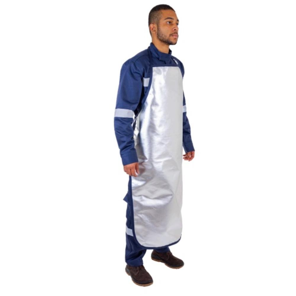 EPI aprovado para proteção do tronco do usuário contra agentes térmicos (pequenas chamas, calor de contato, convectivo, radiante e metais fundidos). Avental confeccionado em Aramida Carbono Aluminizado de 280g/m forrado com tecido de Algodão FR de 260g/m. Tiras de tecido Anti-Chamas no pescoço e na cintura para ajuste e fixação. Totalmente costurado com linha de Aramida.