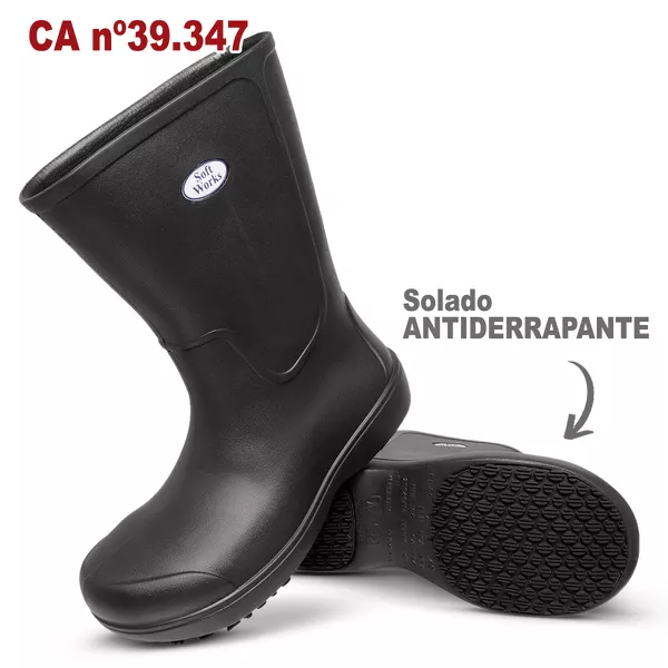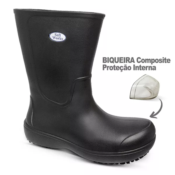 O Cabedal da Bota cano longo com biqueira Soft Works é confeccionado em EVA (Etil Vinil Acetato), um material super leve, que permite extremo conforto e alta absorção de impacto.