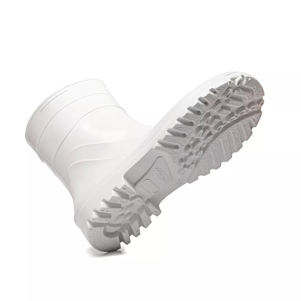 Com cano extra curto de 260 mm, é uma opção leve e prática, com estrias laterais para facilitar o calce e estria no calcanhar para facilitar o descalce. O design sem forro e sem biqueira proporciona leveza e fácil lavagem, enquanto o acabamento espelhado garante toque emborrachado e excelente aparência higiênica.