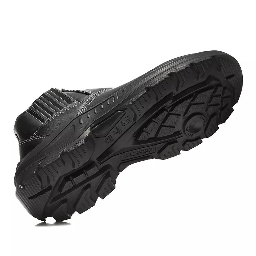 O solado bidensidade em PU, injetado diretamente ao cabedal, proporciona resistência ao escorregamento (SRC), proteção contra óleo combustível (FO), absorção de energia no salto (E) e propriedade antiestática (A). Além disso, atende à norma WRU, com resistência à penetração e absorção de água no cabedal.