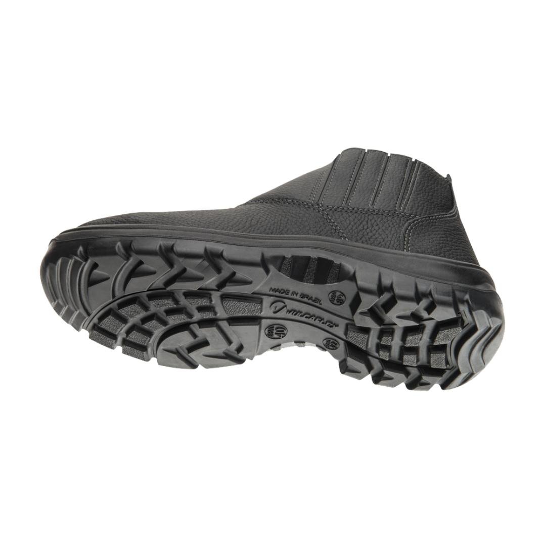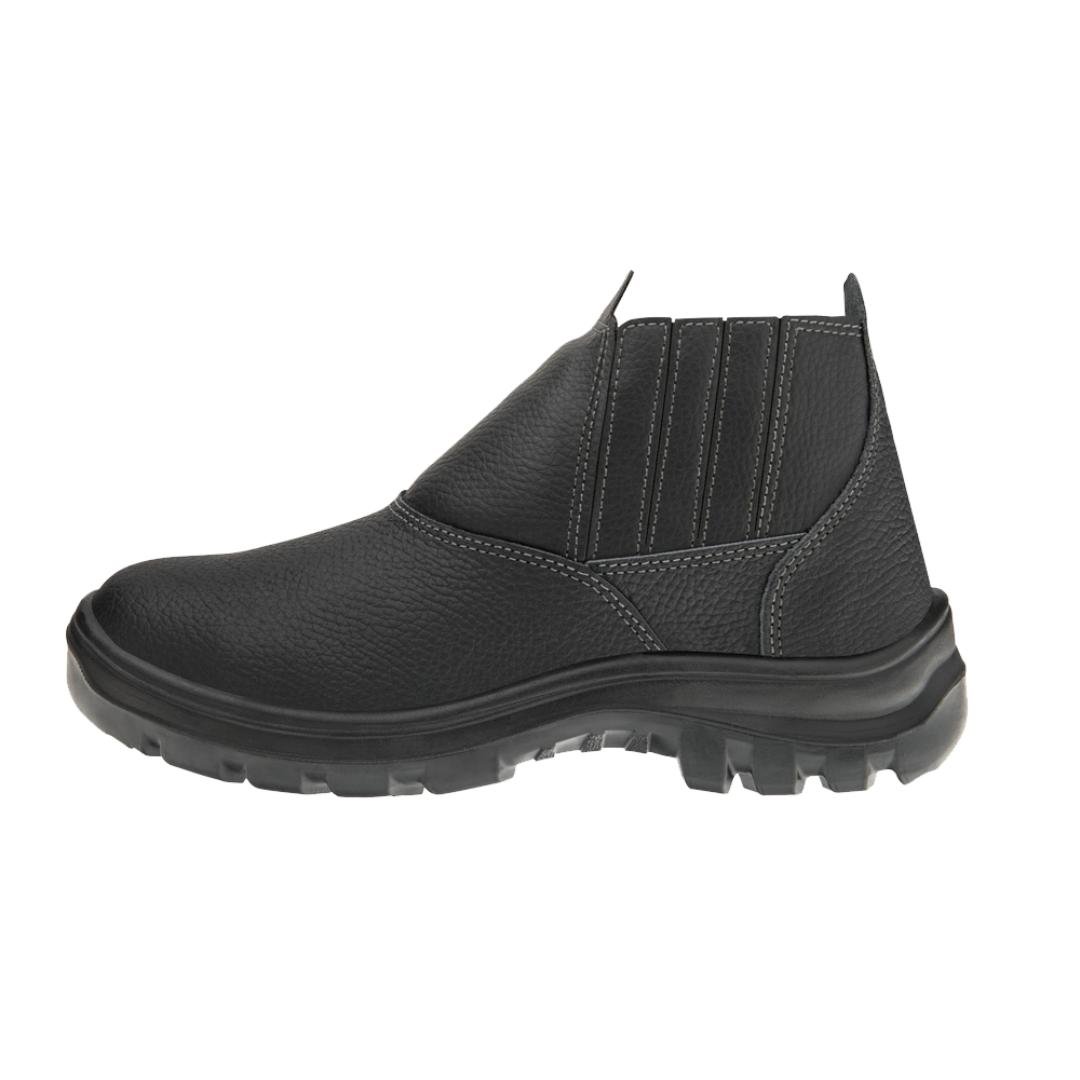 Bota em couro relax na cor preta, ideal para trabalhadores das áreas de produção, serviços gerais e prestadores de serviço. Esta Vulcaflex tem biqueira de plástico, dorso acolchoado, abas para facilitar o calce, e fechamento em elástico nas laterais. O solado em PU bidensidade tem sistema de absorção de impacto, sendo injetado diretamente no cabedal e palmilha de montagem em EVA. Este sapato conta com a certificação IBTeC de conforto.