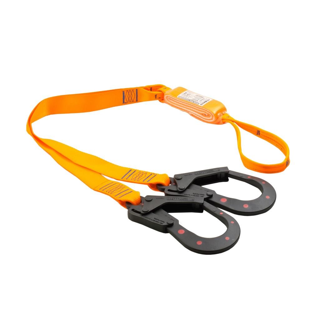 Talabarte de Segurança duplo modelo “Y” confeccionado em fita retardante à chamas 45mm, com absorvedor de energia, dois conectores DIELÉTRICOS classe “A” com abertura de 55mm, com dupla trava de segurança, alça em poliéster retardante a chamas na outra extremidade para laçar no ponto de conexão do cinto paraquedista.